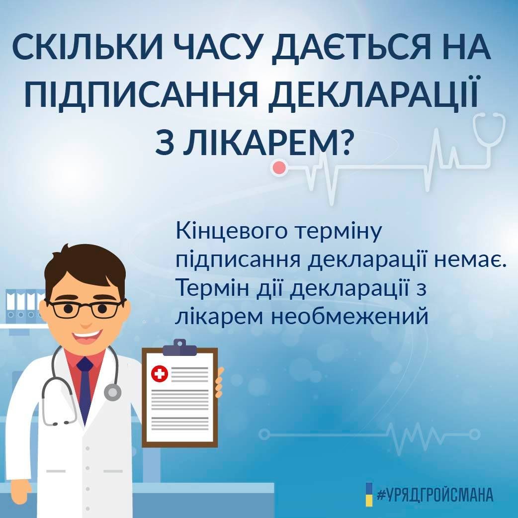 Термін дії декларації з лікарем необмежений. Вона діє до того часу, доки ви не вирішите підписати декларацію з іншим лікарем, якщо з якихось причин захочете його змінити. В такому випадку попередня декларація анулюється автоматично, вам не потрібно приходити до свого попереднього лікаря.